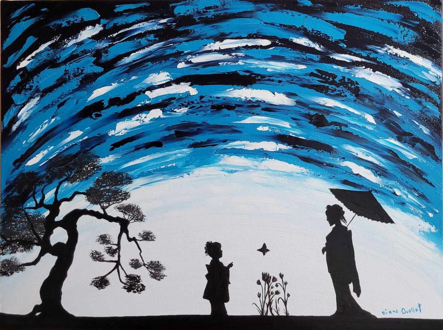 Fait à la spatule pour le ciel et au pinceau pour les ombres chinoises, j’aime bien le côté contrastant. Créé en 2023.