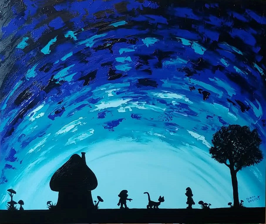 7e œuvre de ma collection Ombre Chinoise, inspiration des petits êtres bleus de mon enfance J ! Fait à la spatule pour le ciel et au pinceau pour les ombres chinoises. Créé en 2022.